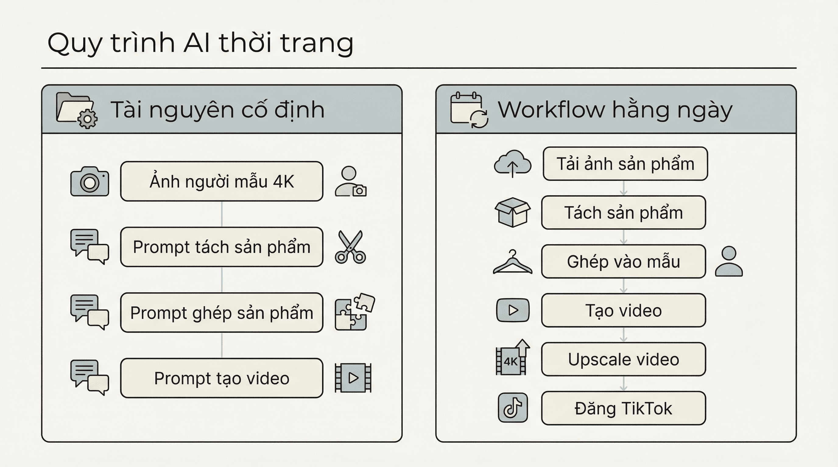 Công việc mỗi ngày của mình xoay quanh một vòng lặp quen thuộc: tải ảnh sản phẩm, tách sản phẩm, ghép sản phẩm vào ảnh mẫu, tạo video, tăng độ nét rồi đăng video.