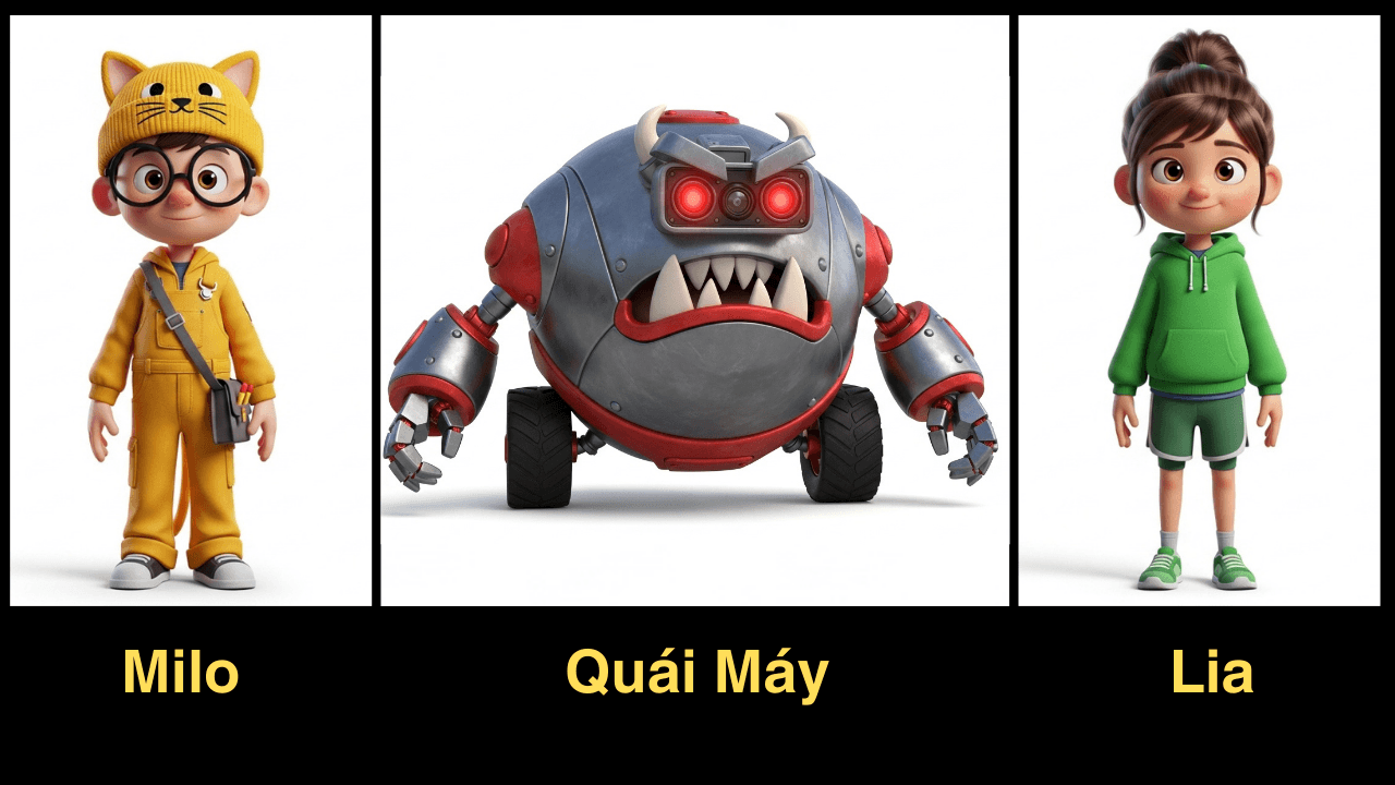 2 | Vẽ ảnh mẫu (Character Sheet) | 10 phút | Gemini (Tạo ảnh) | Ảnh rõ nét: Lia, Milo, Quái Máy |