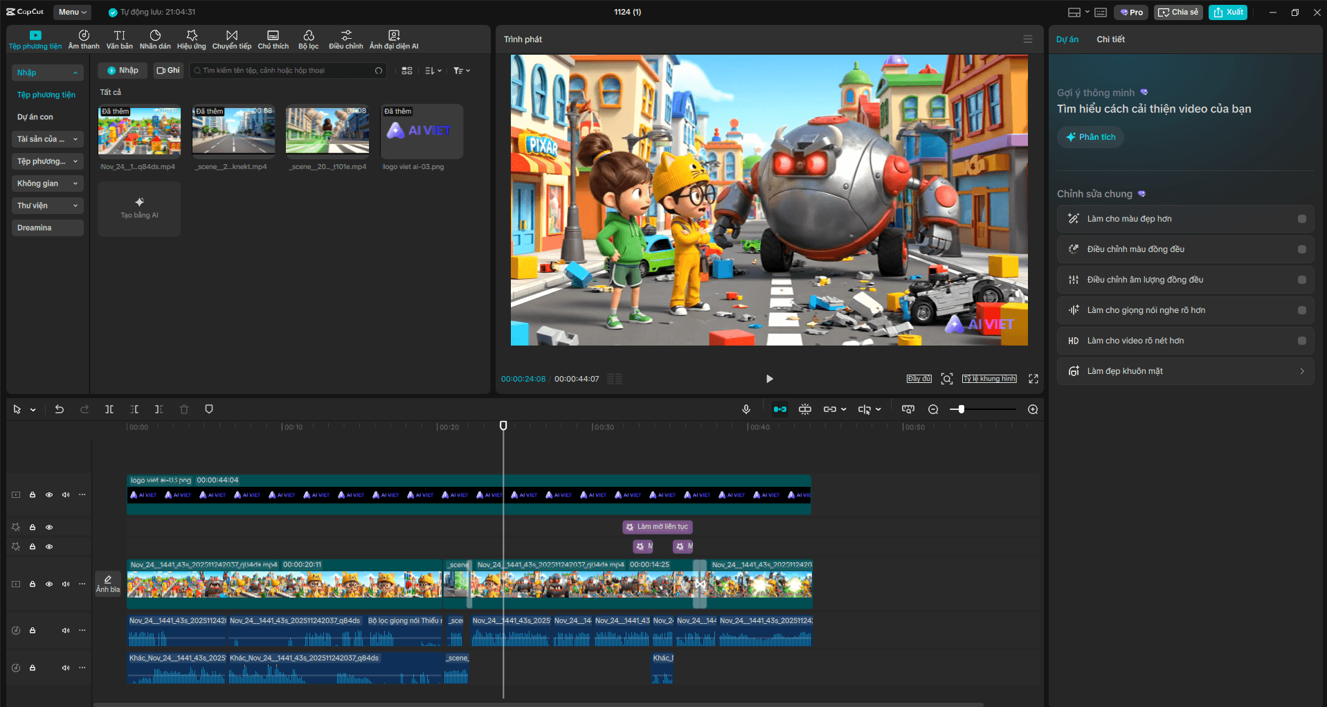 Sau khi tạo đủ các cảnh, tải về và dùng CapCut để ghép nối. Đừng quên thêm nhạc nền "vui nhộn acoustic" và hiệu ứng âm thanh "boing boing" để video sống động hơn.