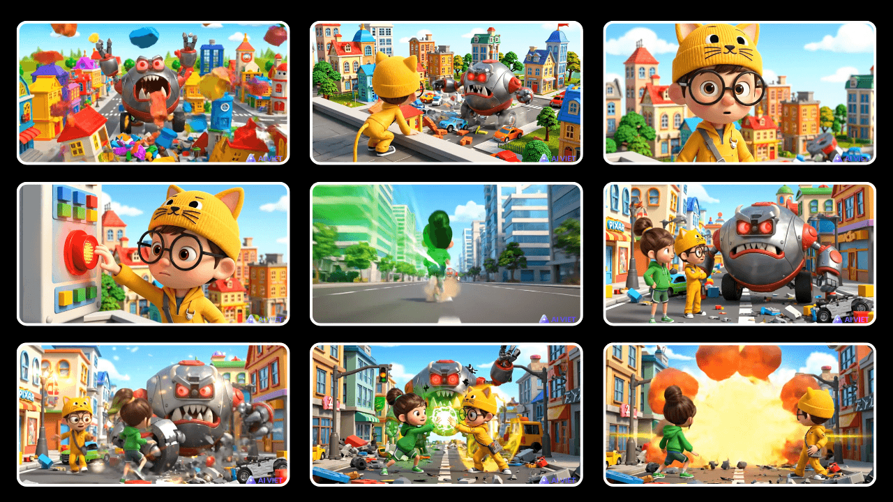 "Giữ nguyên: Quái vật màu xám kim loại, mắt đỏ lớn và có bánh xe, dựa trên hình mẫu. Phong cách cố định: Hoạt hình cartoon dễ thương Pixar mini, màu sắc tươi sáng rực rỡ, chuyển động bouncy vui nhộn. + Hành động: Thành phố đồ chơi yên bình. Quái Máy xám to mắt đỏ bánh xe bất ngờ xuất hiện và đập phá. Gạch đá bay tung toé. Camera: Quay rộng, zoom chậm vào Quái. Lời thoại tiếng việt: Quái gầm gừ: 'Rào rào! Ta phá hết!'"