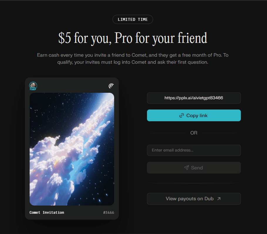 Đặc biệt, Comet đang có chương trình giới thiệu người dùng (Affiliate Program) để thu hút cộng đồng trải nghiệm sớm.